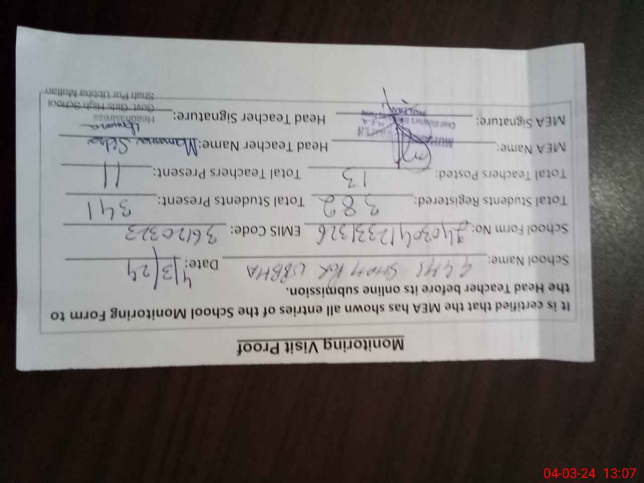 | Certified that this School was Inspected by the Undersigned MEA/DMO Today and the Information Stated Above is as Per Record. | |||||