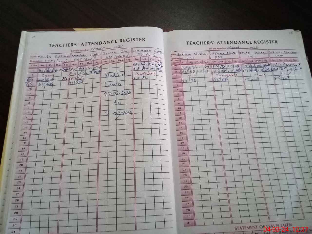 | Leave | Duty | Absent | Maternity | Medical | Ex- Pak |