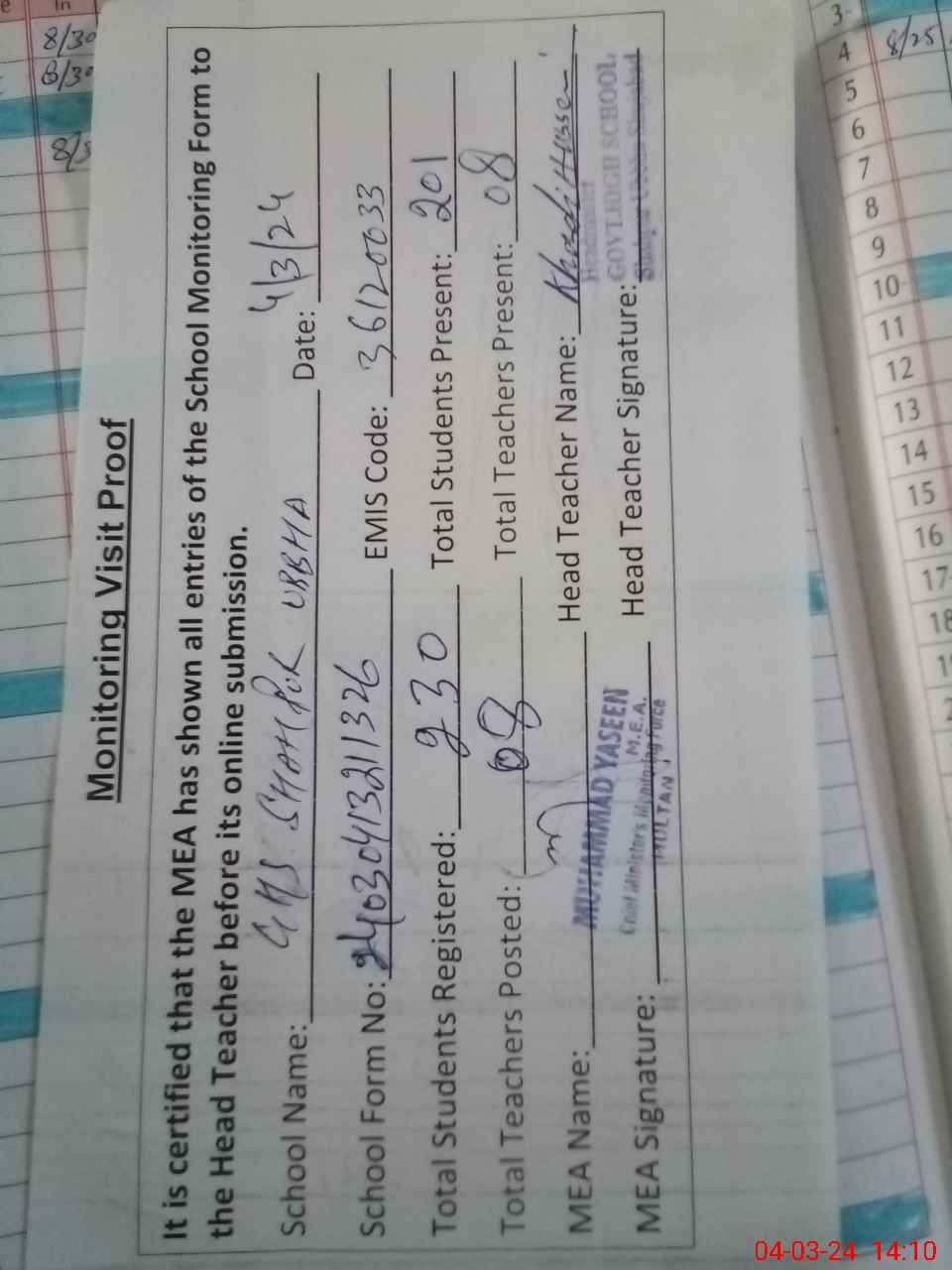 | EMIS Code: 36120033 | Name of School: GHS SHAH PUR UBBHA SHUJABAD | |||