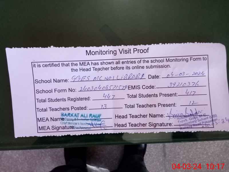 | EMIS Code: 39210376 | Name of School: GGES MC NO. 1 LIBRARY RAILWAY ROAD | |||