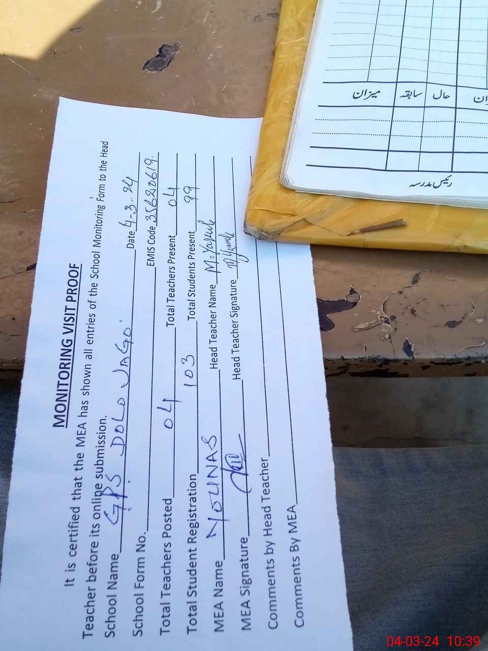| Attendance Register | Head Teacher | MEA with School | Visit Proof |