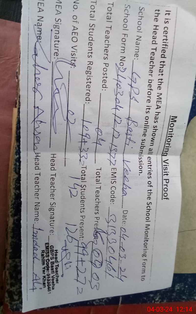 | EMIS Code: 31330461 | Name of School: GPS BASTI VEEHA | |||