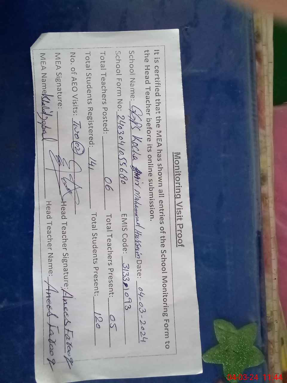 | Attendance Register | Head Teacher | MEA with School | Visit Proof |
