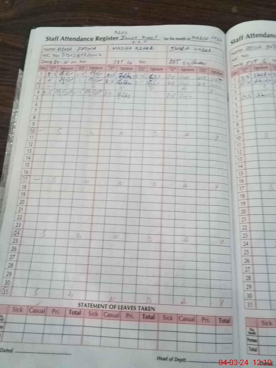 | Leave | Duty | Absent | Maternity | Medical | Ex- Pak |