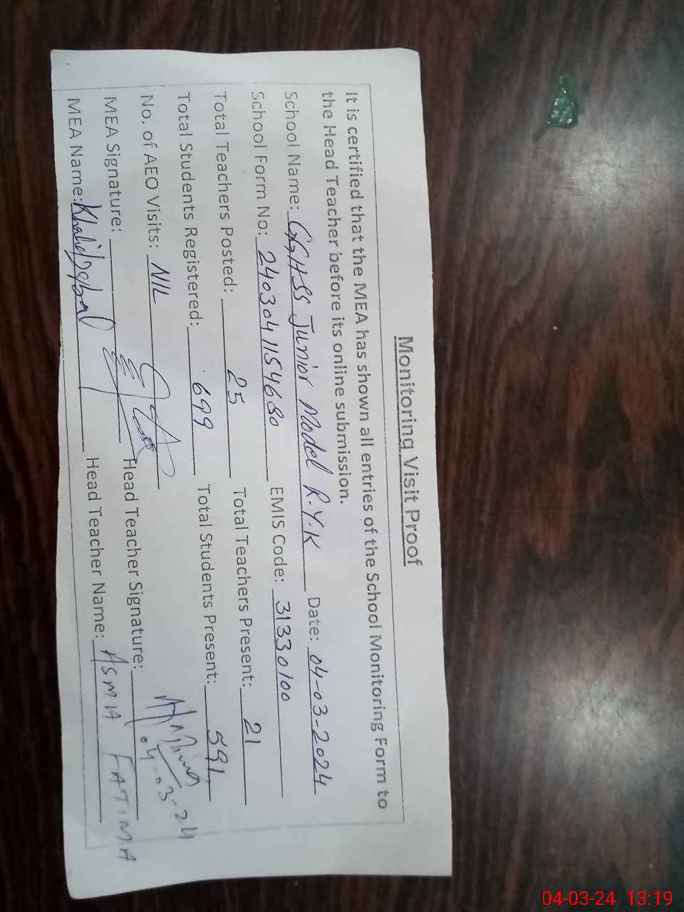 | Attendance Register | Head Teacher | MEA with School | Visit Proof |