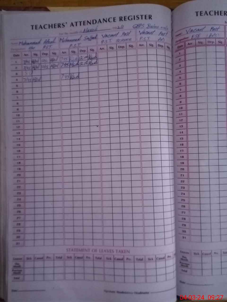 | Name: M.AF**** Designation: (School Headmaster's/Headmistress's) PST/PTC/JV Phone/Cell Number: 03**** |