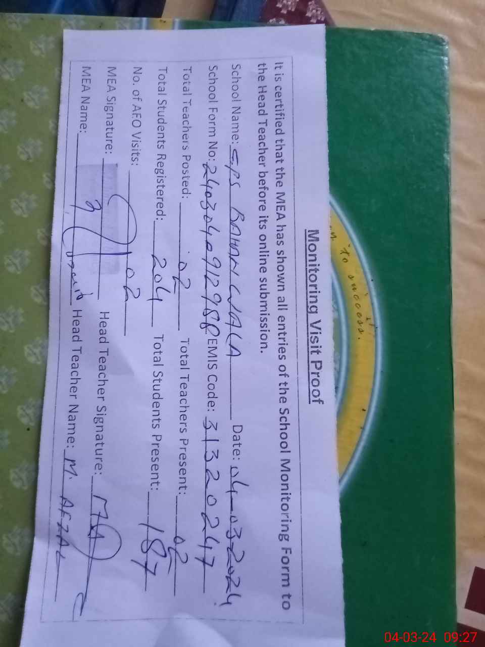 | Attendance Register | Head Teacher | MEA with School | Visit Proof |