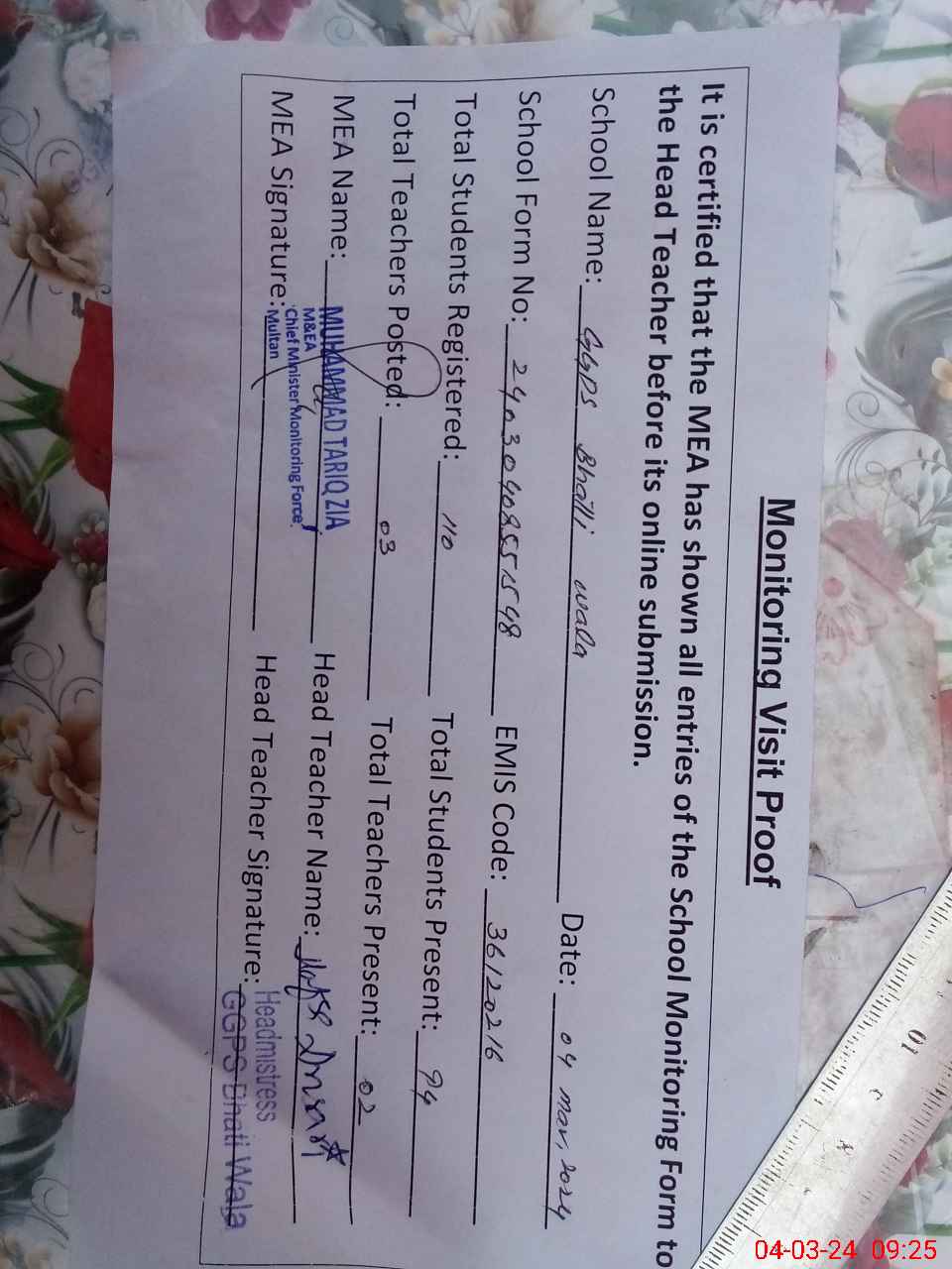 | EMIS Code: 36120216 | Name of School: GGPS BHATTI WALA SHUJABAD | |||