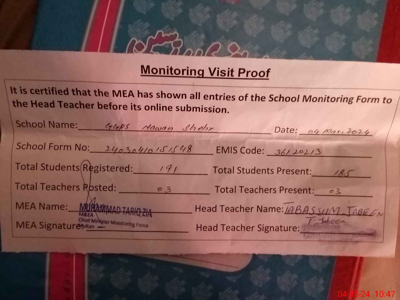 | Attendance Register | Head Teacher | MEA with School | Visit Proof |