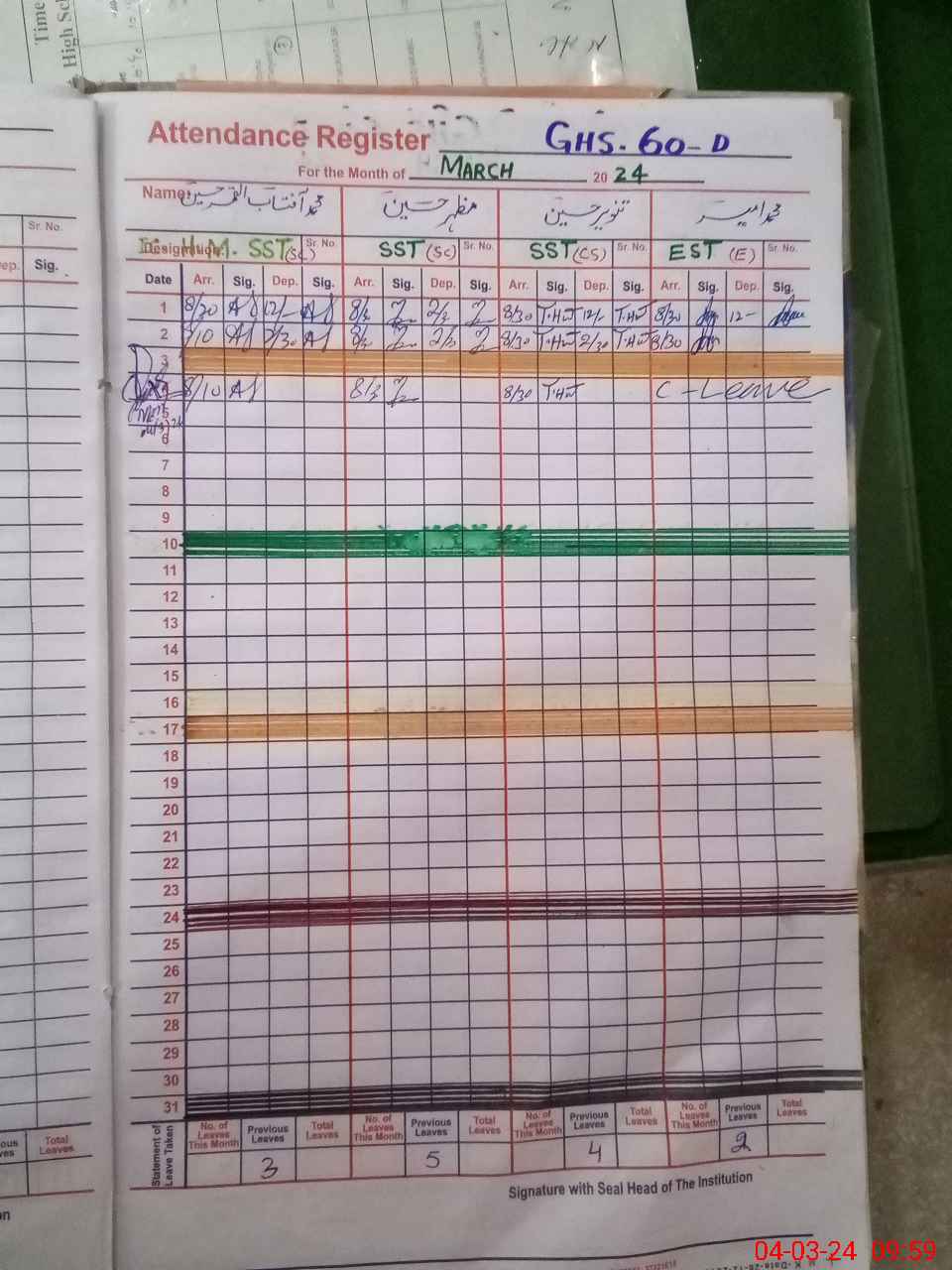 | Leave | Duty | Absent | Maternity | Medical | Ex- Pak |