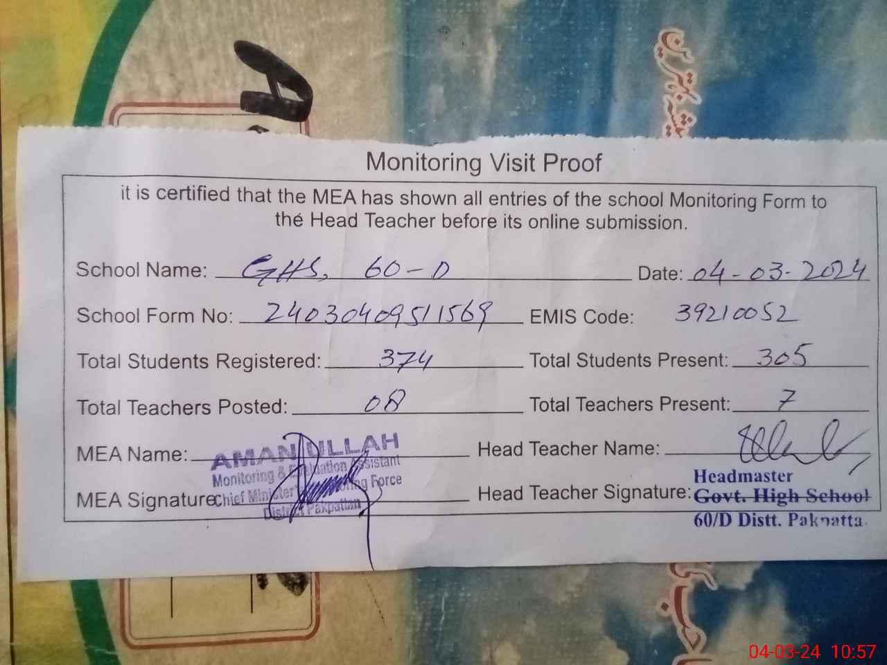 | Attendance Register | Head Teacher | MEA with School | Visit Proof |
