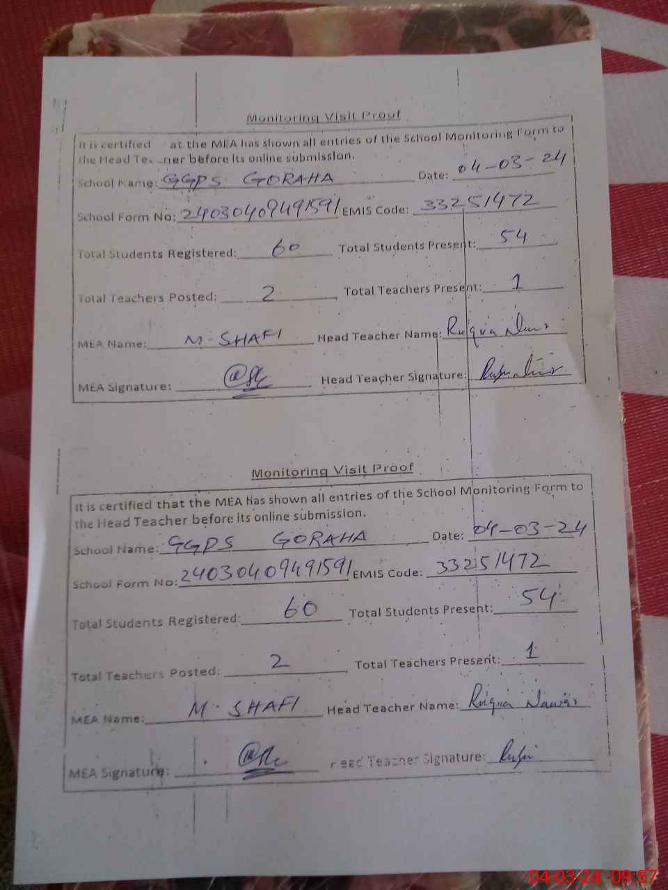 | Attendance Register | Head Teacher | MEA with School | Visit Proof |