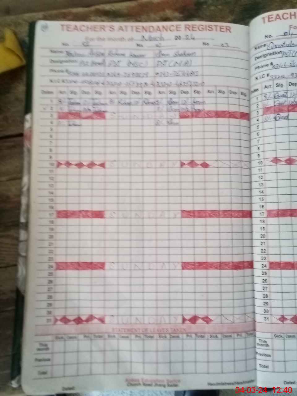 | CNIC | Full Name | Designation | R/C | Absence During Last Calender Month |