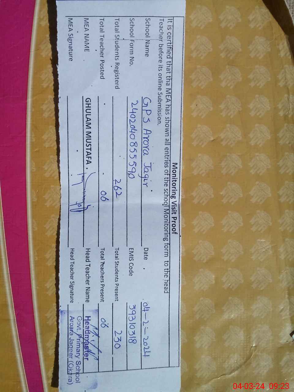 | EMIS Code: 39310318 | Name of School: GPS ARORA JAGIR | |||