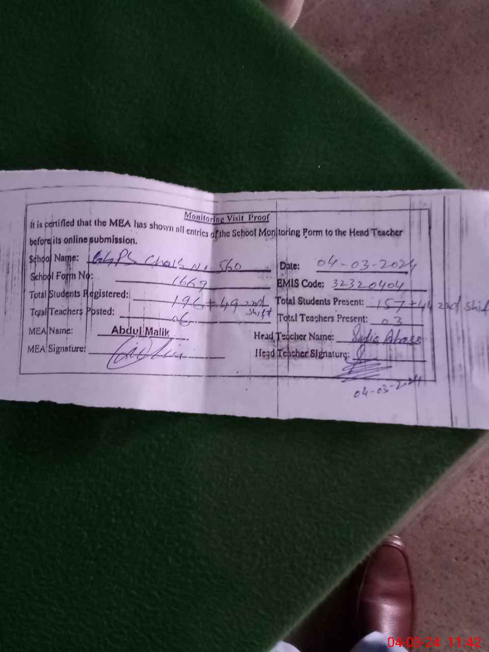 | Attendance Register | Head Teacher | MEA with School | Visit Proof |