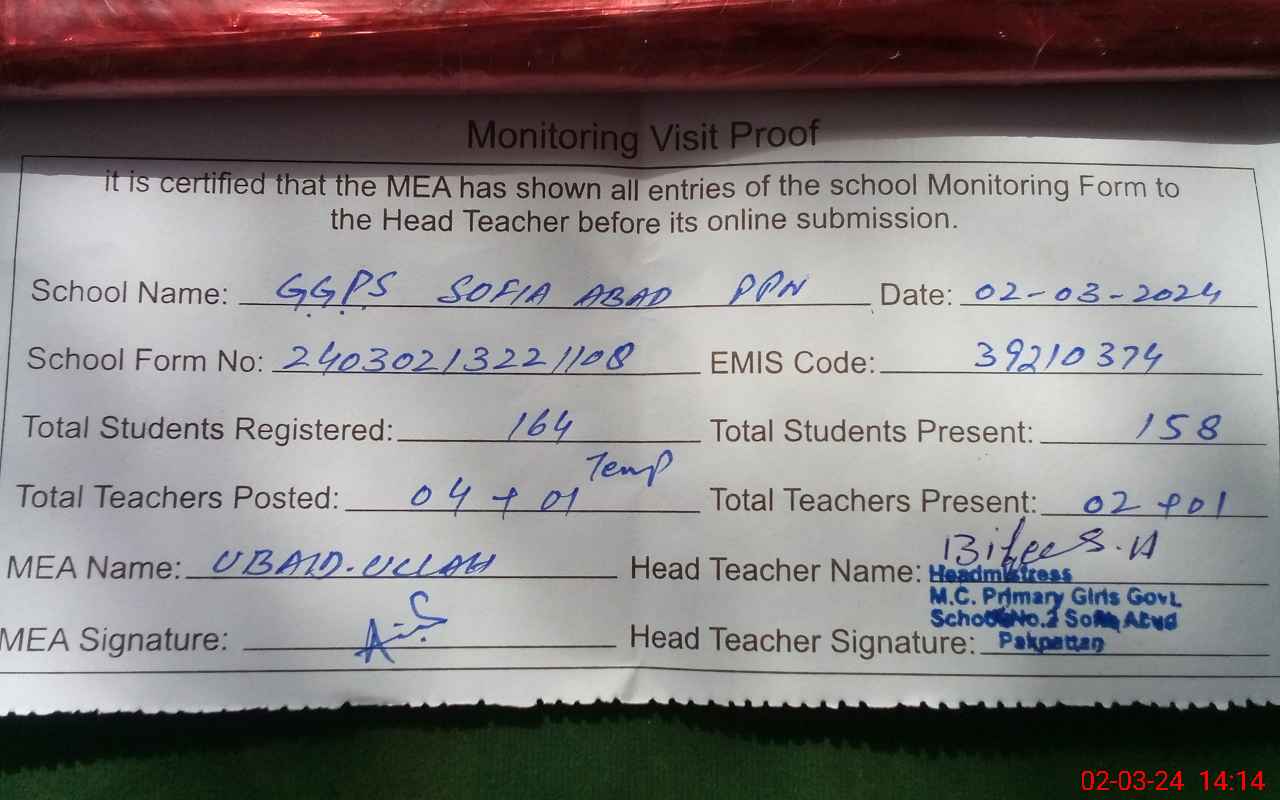| Certified that this School was Inspected by the Undersigned MEA/DMO Today and the Information Stated Above is as Per Record. | |||||