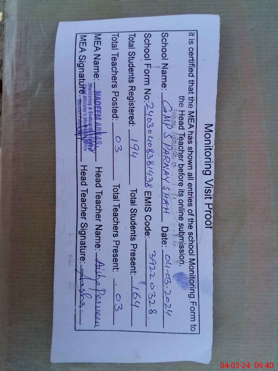 | EMIS Code: 39220328 | Name of School: GMPS PARNAY SHAH PO NOORA RATH ARIF WALA | |||