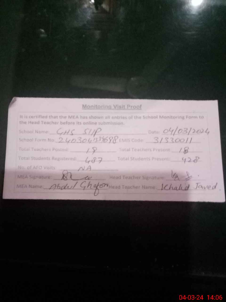 | Attendance Register | Head Teacher | MEA with School | Visit Proof |