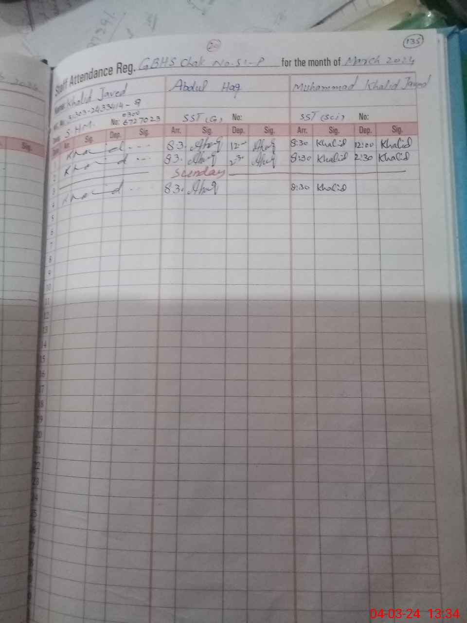 | CNIC | Full Name | Designation | R/C | Absence During Last Calender Month |