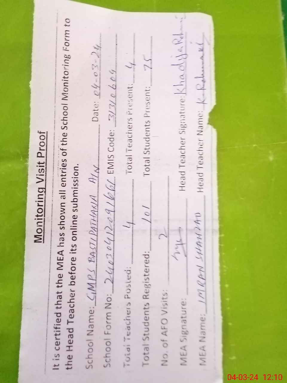 | Attendance Register | Head Teacher | MEA with School | Visit Proof |