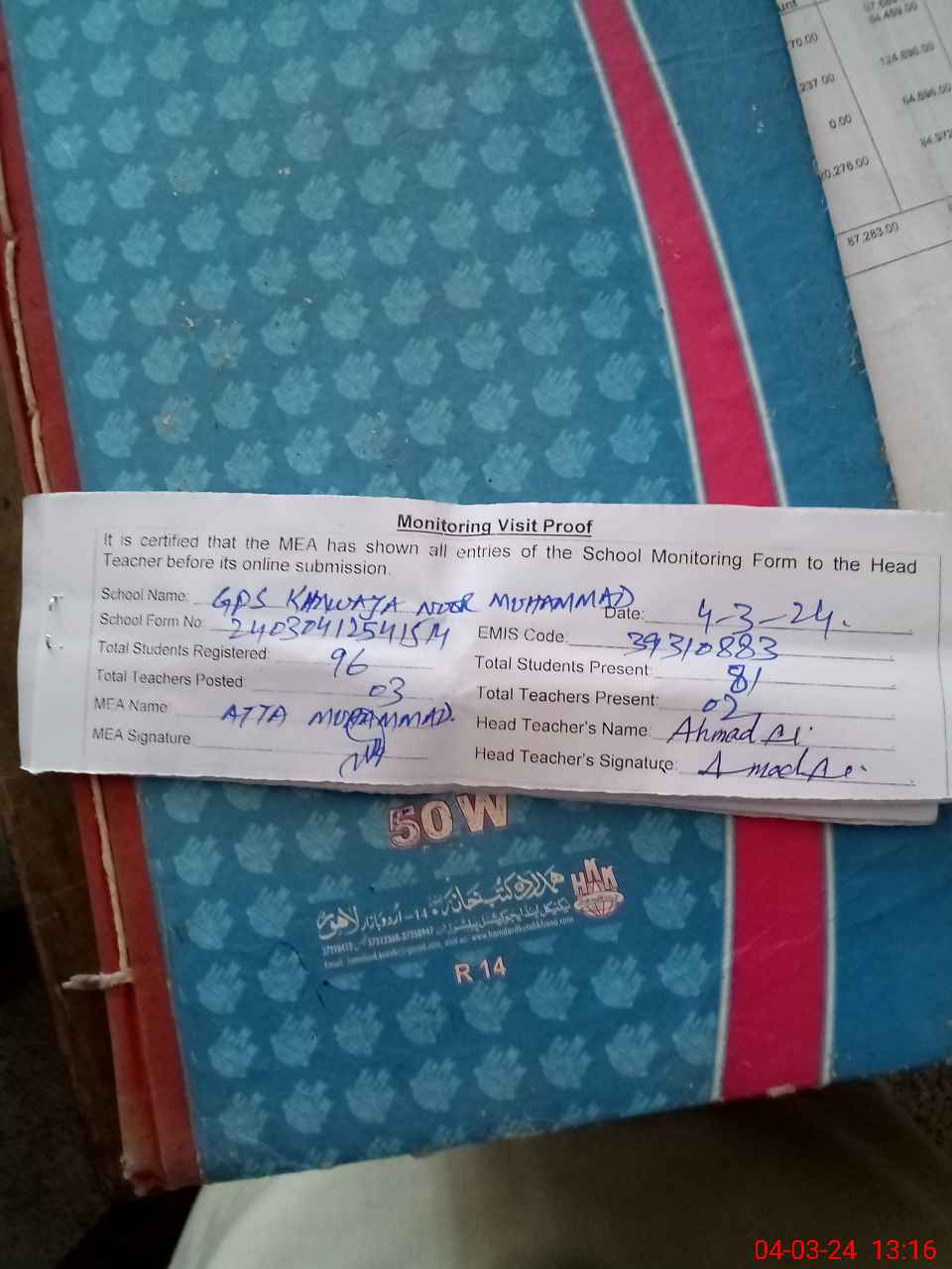 | Attendance Register | Head Teacher | MEA with School | Visit Proof |