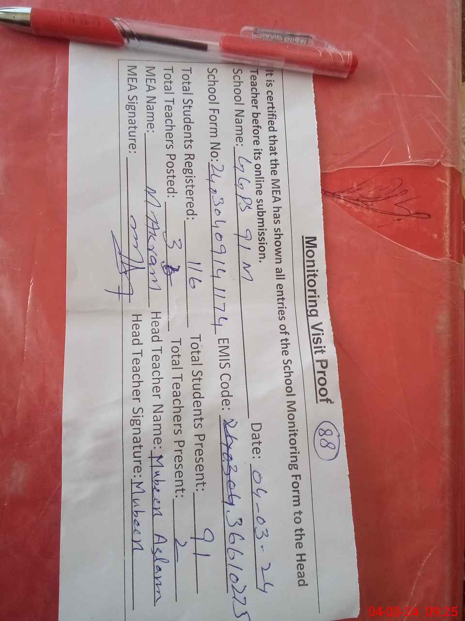 | Remarks (Use Separate Page if Required): NSB and books record are not shown to MEA as the head teacher is on CL and all the record are with her | |||||
