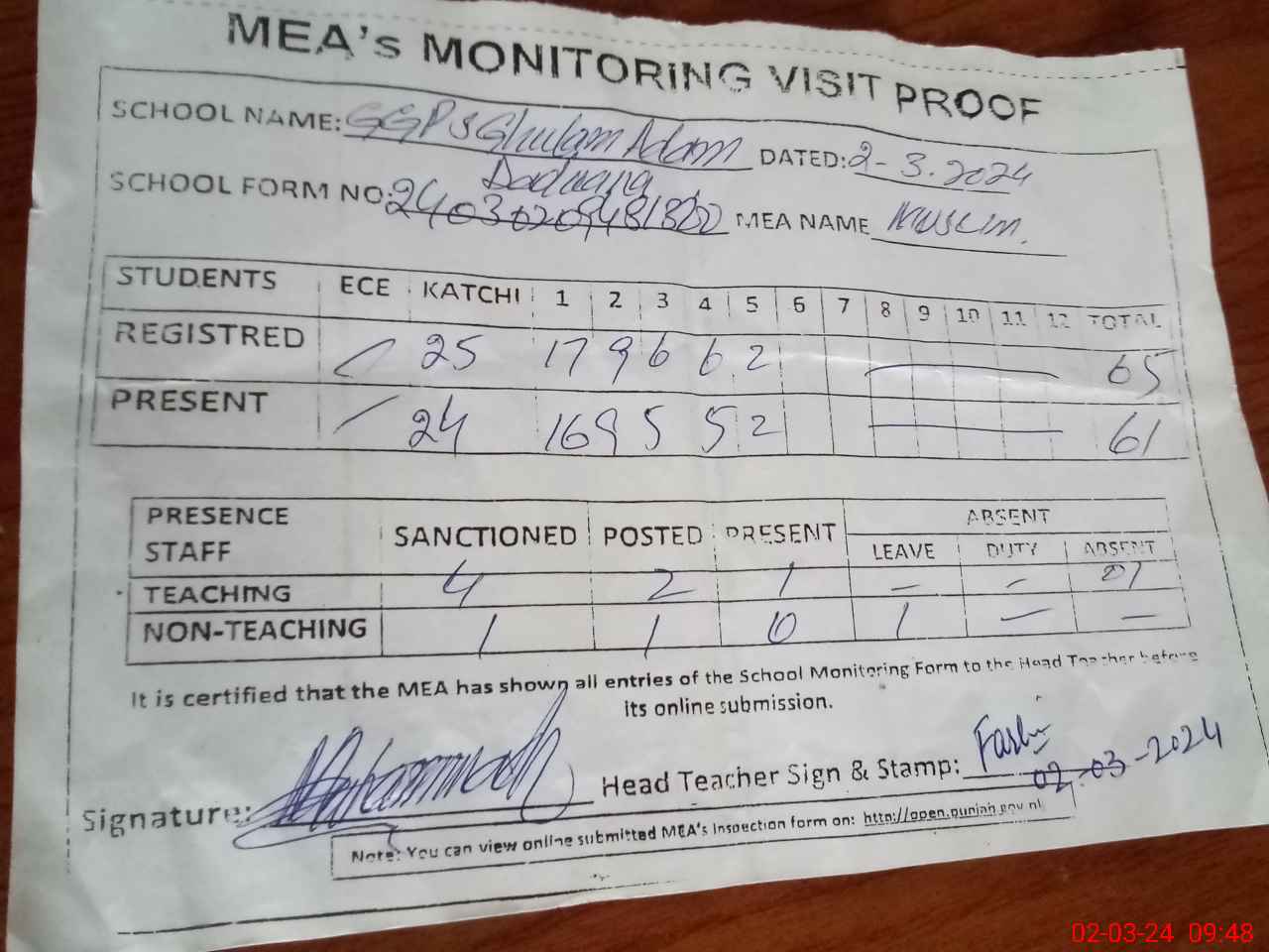 | Attendance Register | Head Teacher | MEA with School | Visit Proof |