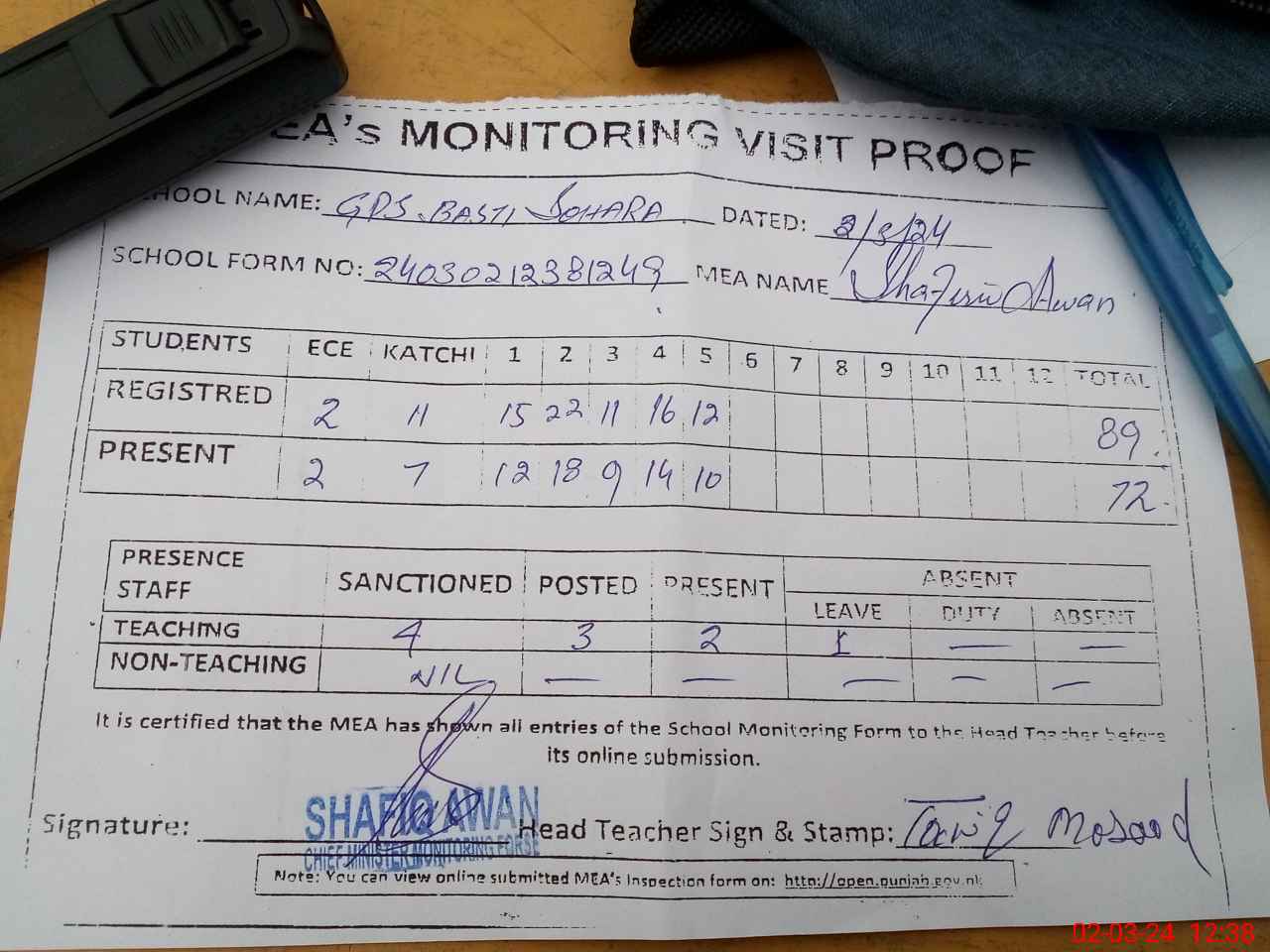 | Attendance Register | Head Teacher | MEA with School | Visit Proof |