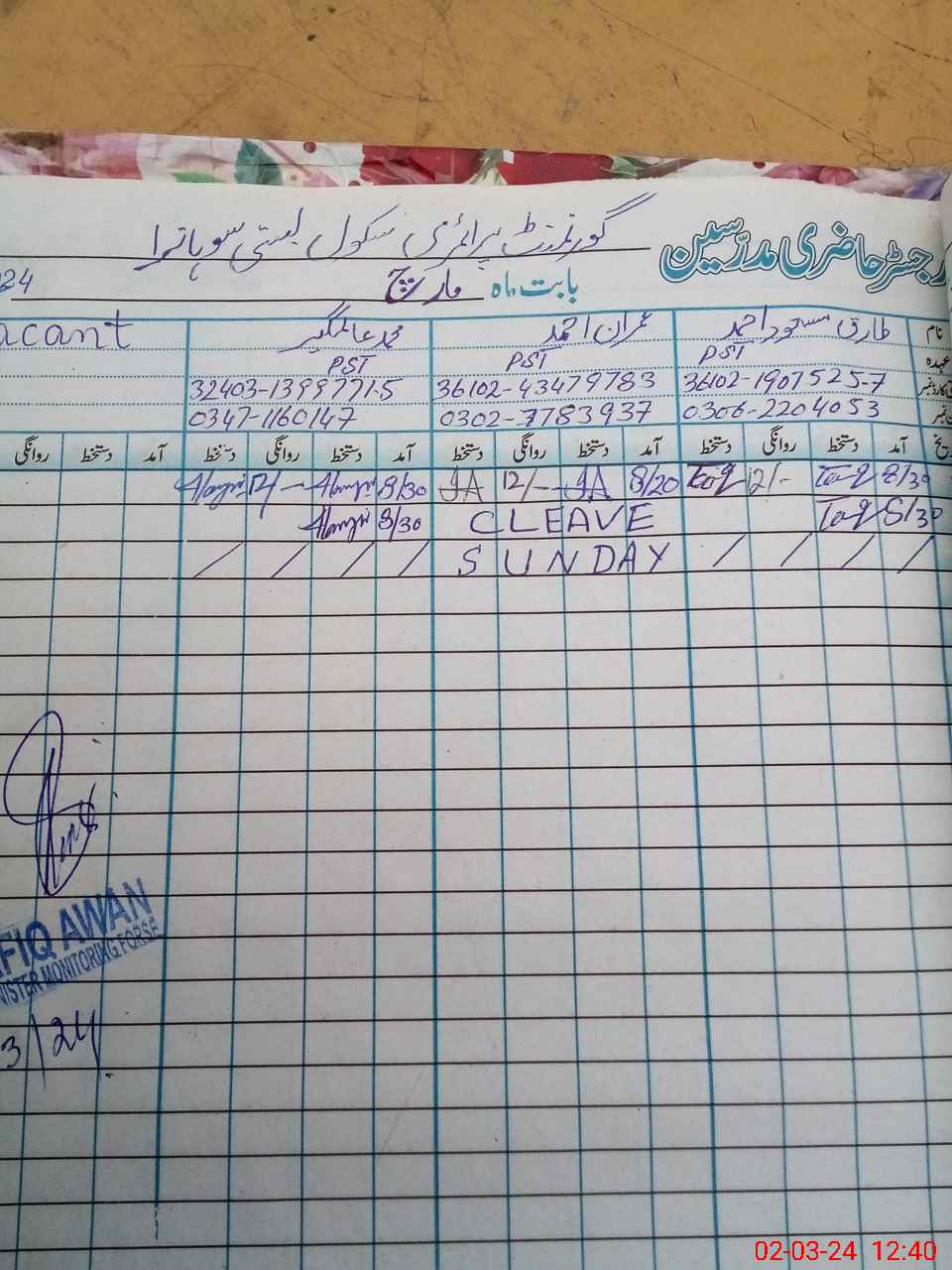 | Name: TA**** MA**** AH**** Designation: (School Headmaster's/Headmistress's) PST Phone/Cell Number: 03**** |