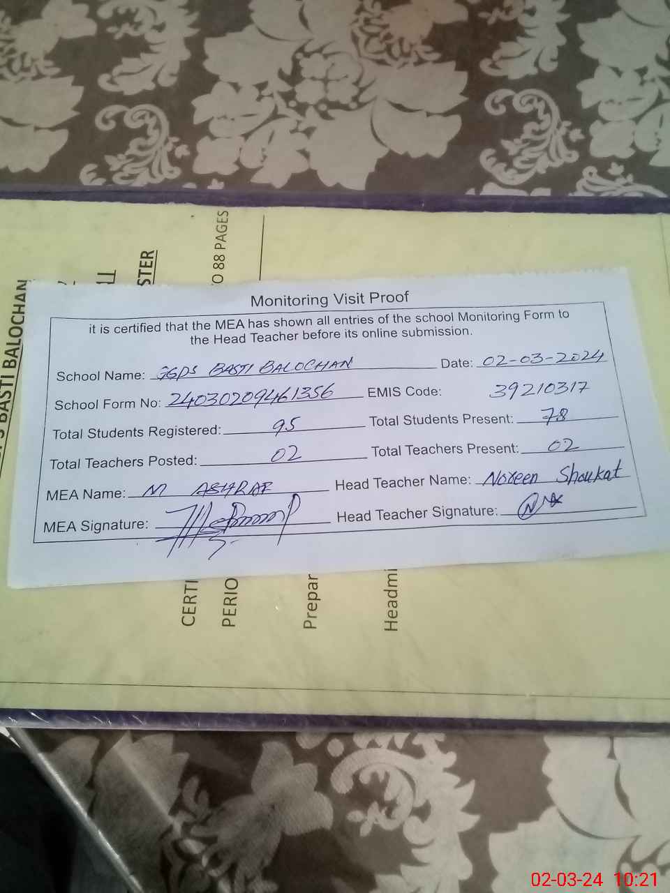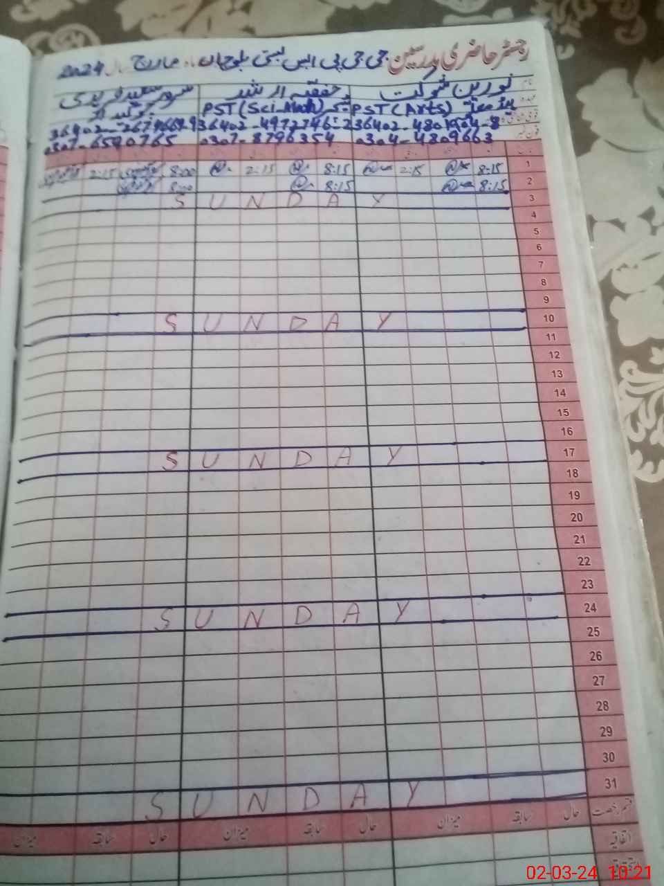 | Name: No**** sh**** Designation: (School Headmaster's/Headmistress's) PST Phone/Cell Number: 03**** |
