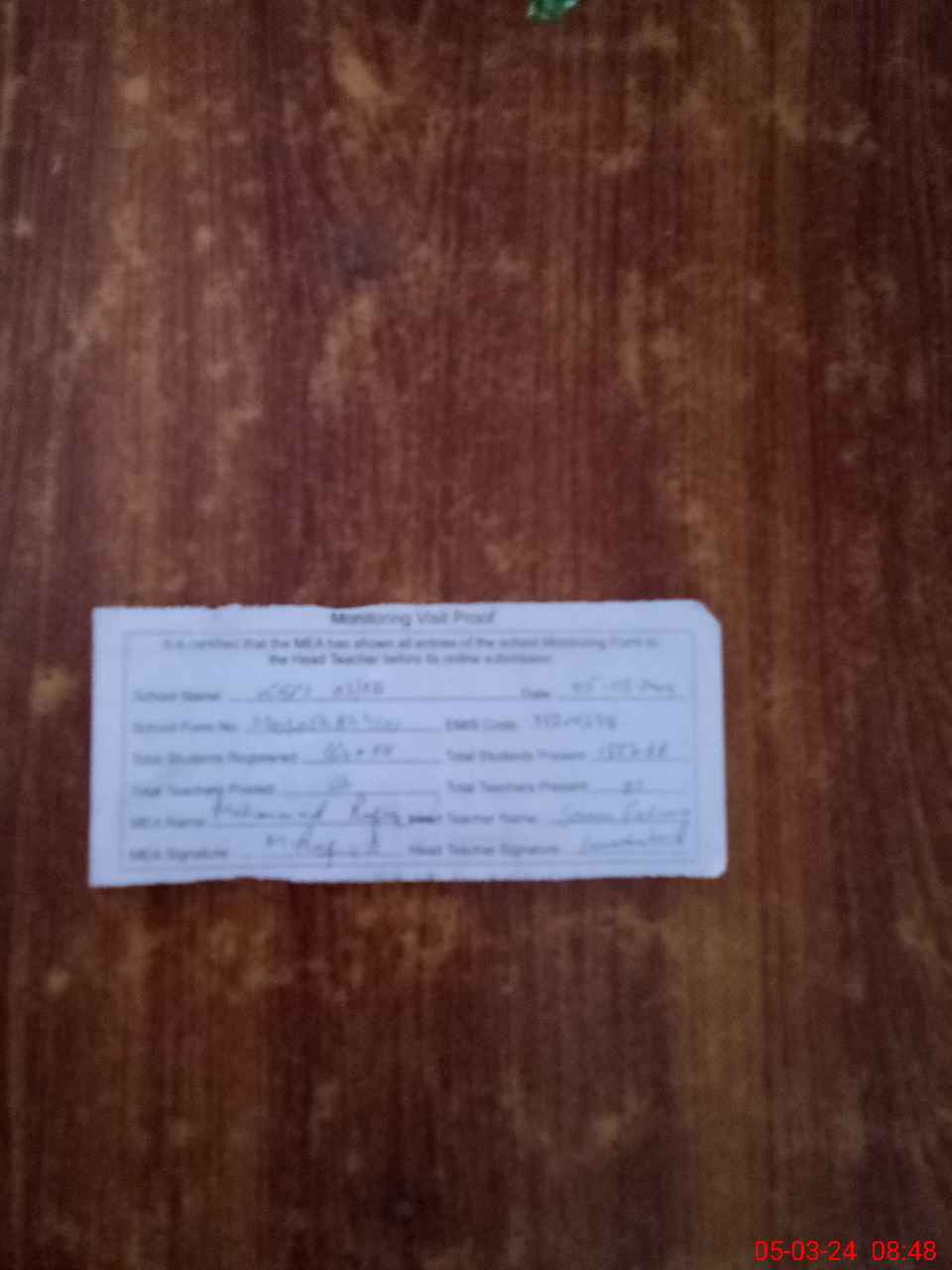 | Attendance Register | Head Teacher | MEA with School | Visit Proof |