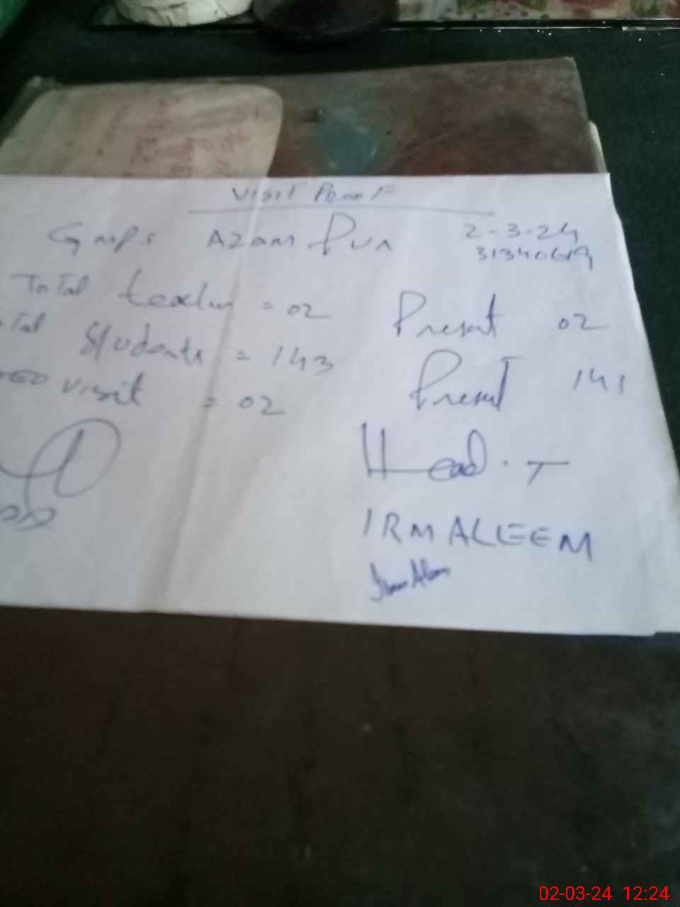 | Name: Ir**** Al**** Designation: (School Headmaster's/Headmistress's) PST Phone/Cell Number: 03**** |