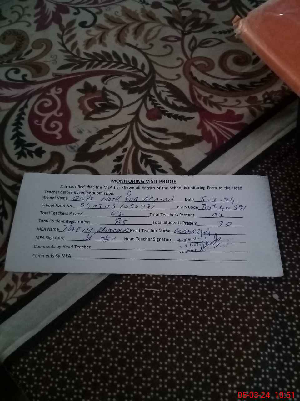 | Attendance Register | Head Teacher | MEA with School | Visit Proof |