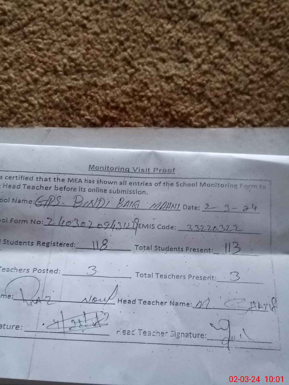 | Attendance Register | Head Teacher | MEA with School | Visit Proof |