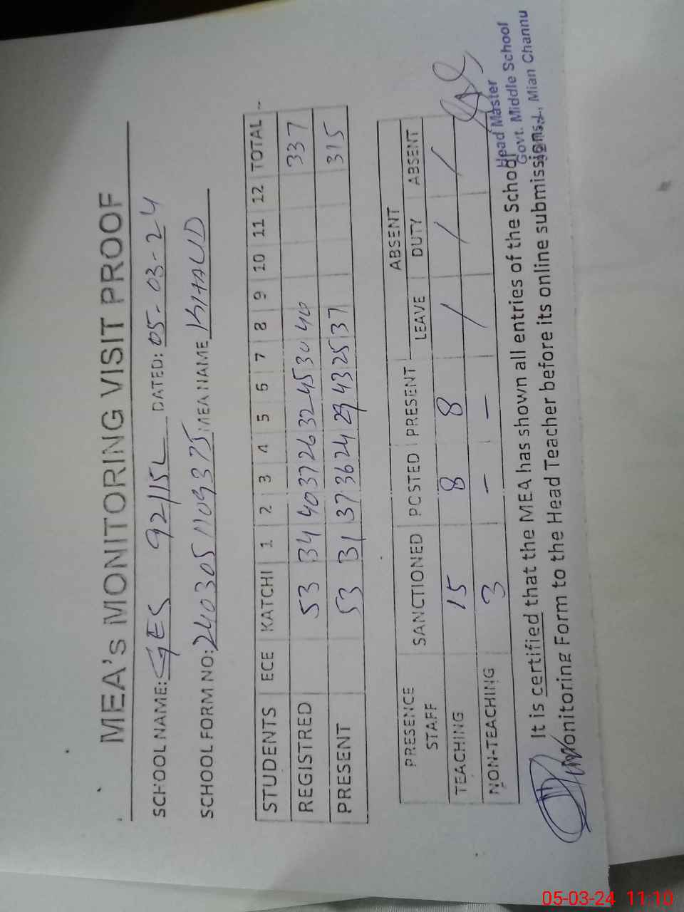 | Attendance Register | Head Teacher | MEA with School | Visit Proof |