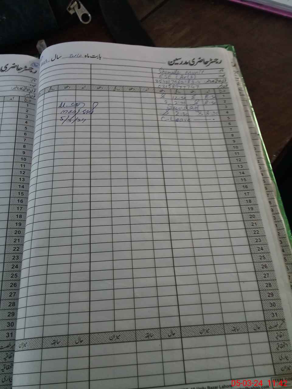 | CNIC | Full Name | Designation | R/C | Absence During Last Calender Month |