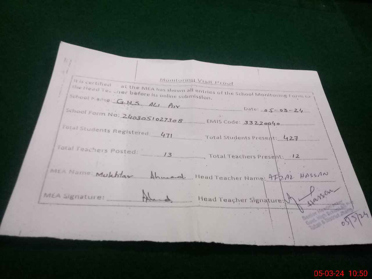 | EMIS Code: 33220040 | Name of School: GHS ALI PUR | |||