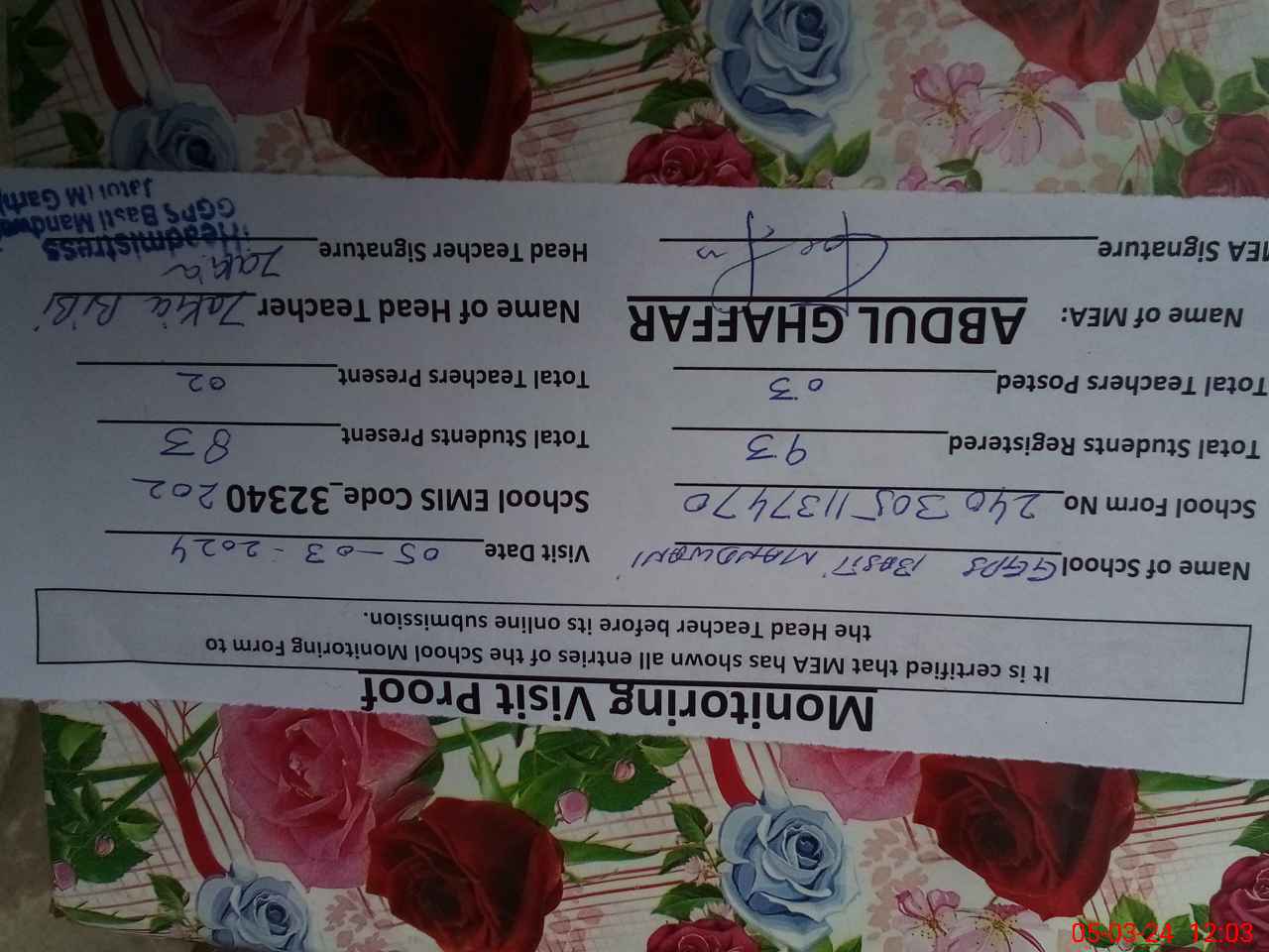 | Attendance Register | Head Teacher | MEA with School | Visit Proof |