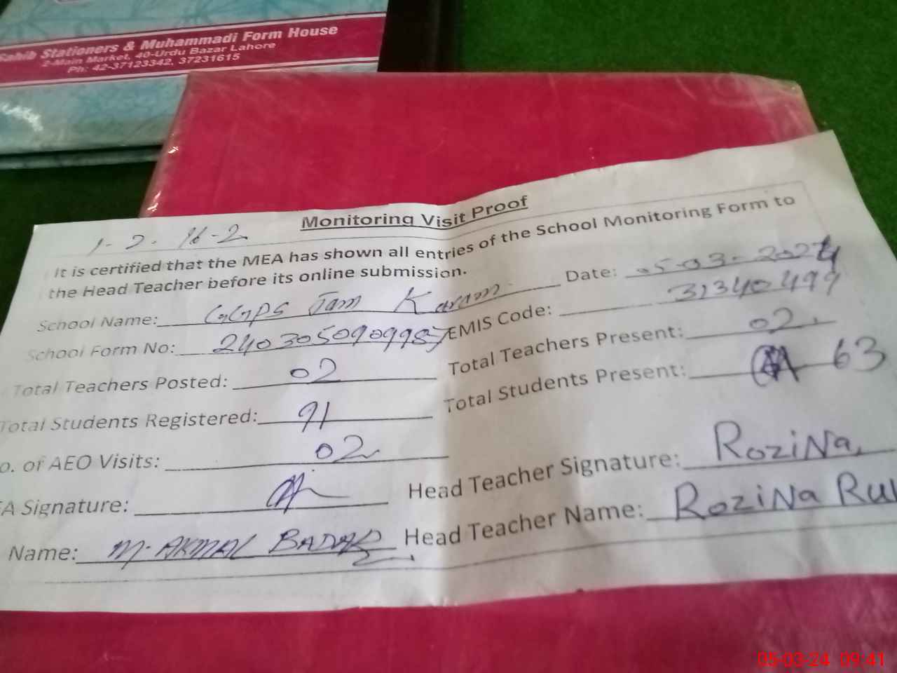 | Attendance Register | Head Teacher | MEA with School | Visit Proof |
