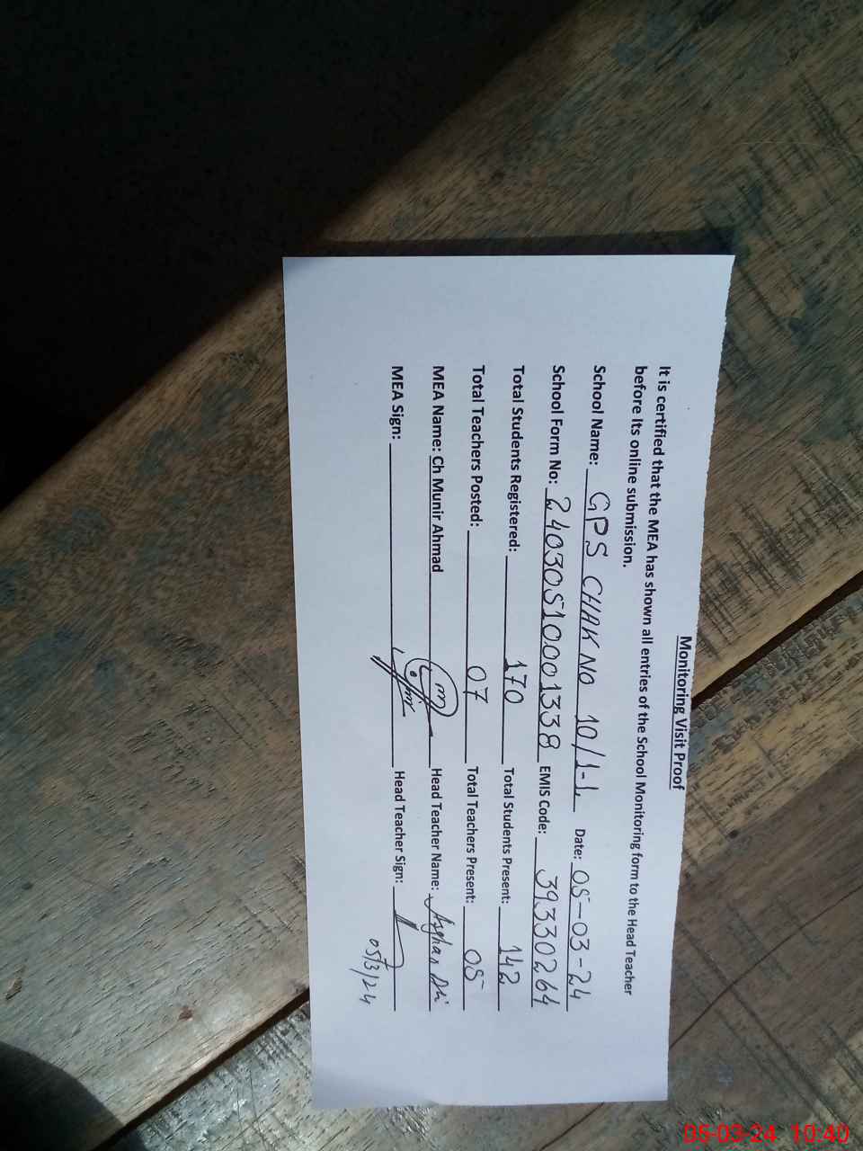 | Attendance Register | Head Teacher | MEA with School | Visit Proof |