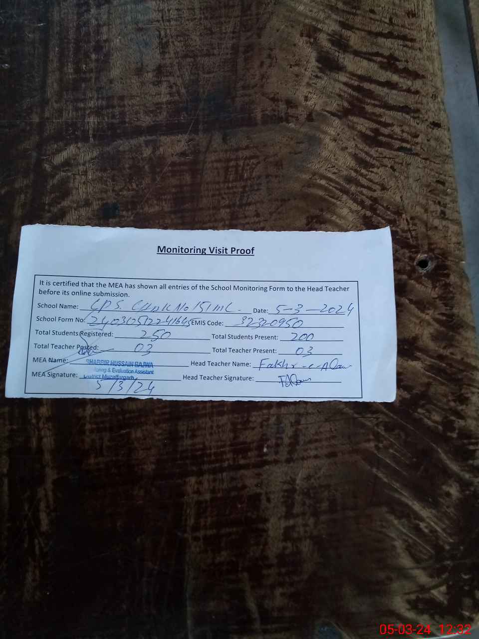 | Attendance Register | Head Teacher | MEA with School | Visit Proof |