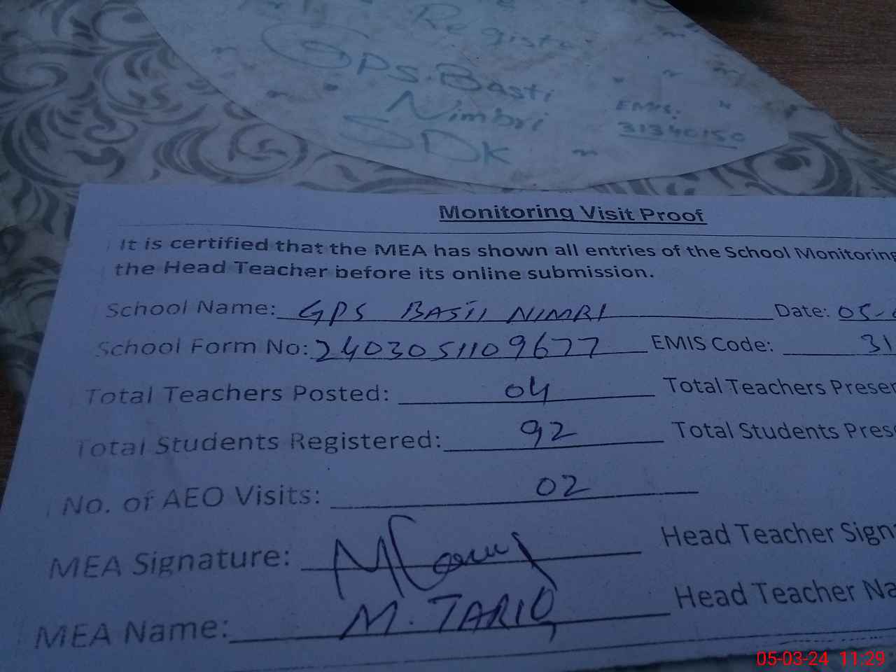 | Certified that this School was Inspected by the Undersigned MEA/DMO Today and the Information Stated Above is as Per Record. | |||||