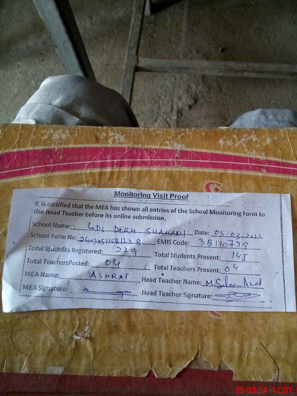 | EMIS Code: 38110739 | Name of School: GPS DERH SHAHANI | |||