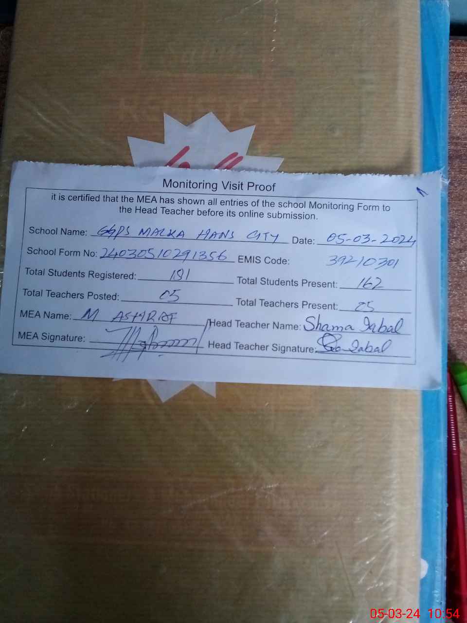 | Attendance Register | Head Teacher | MEA with School | Visit Proof |