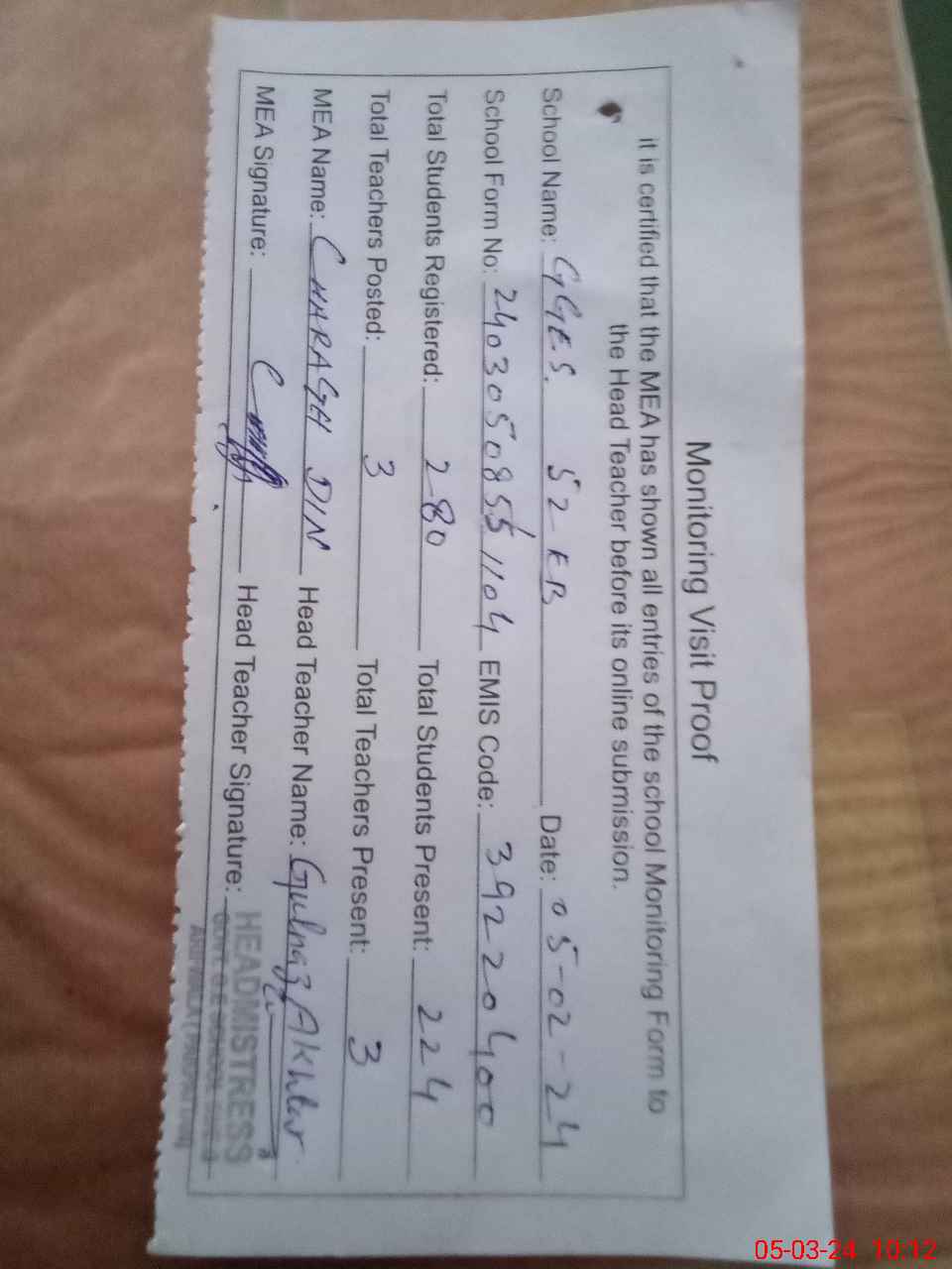 | Attendance Register | Head Teacher | MEA with School | Visit Proof |