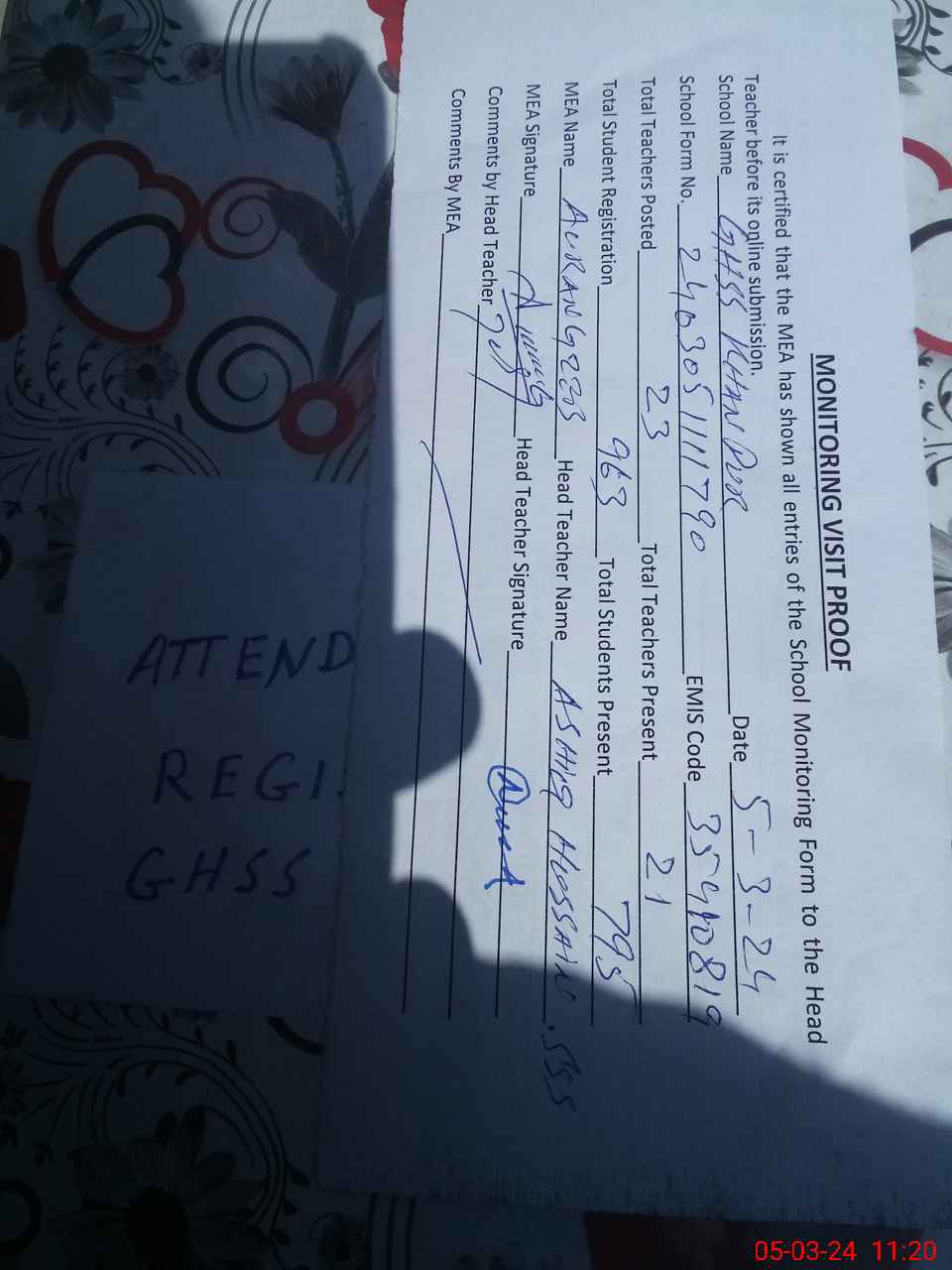 | Attendance Register | Head Teacher | MEA with School | Visit Proof |