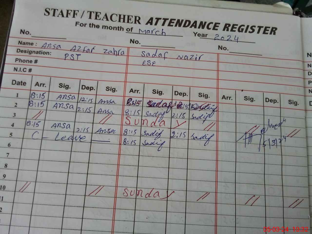 | CNIC | Full Name | Designation | R/C | Absence During Last Calender Month |