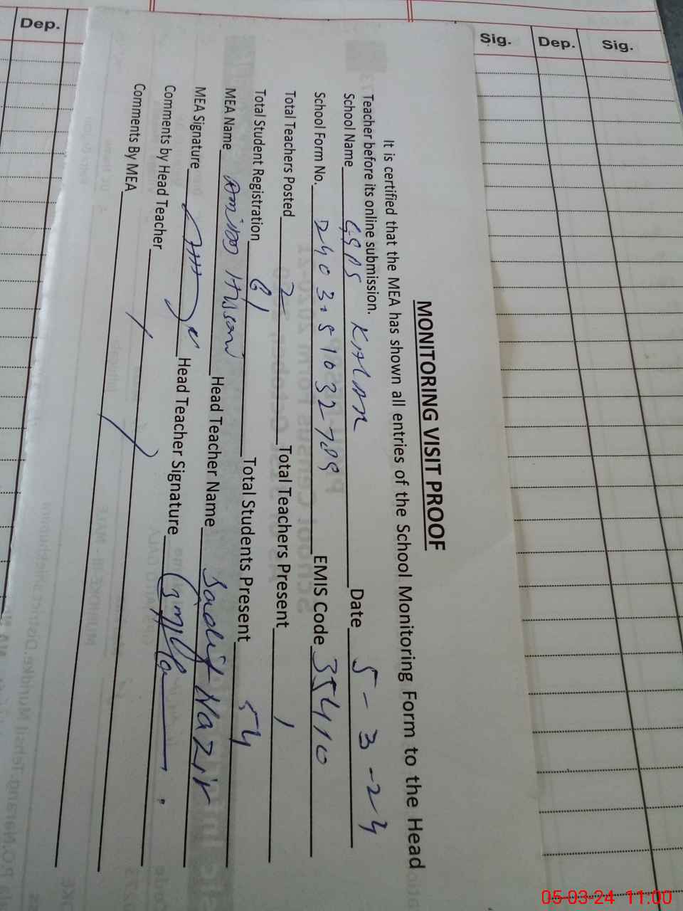 | Attendance Register | Head Teacher | MEA with School | Visit Proof |