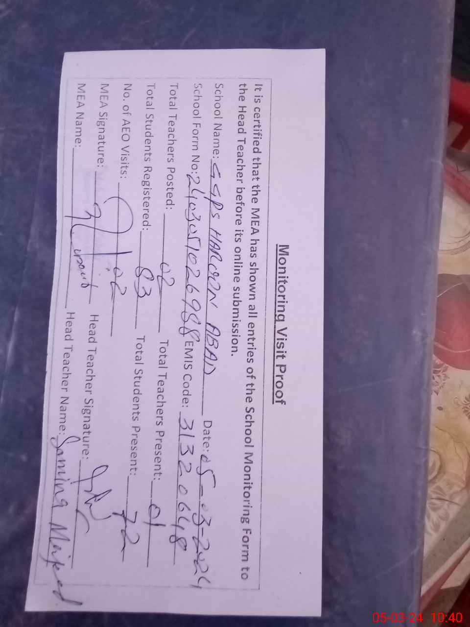 | Name: SA**** MA**** Designation: (School Headmaster's/Headmistress's) PST Phone/Cell Number: 03**** |