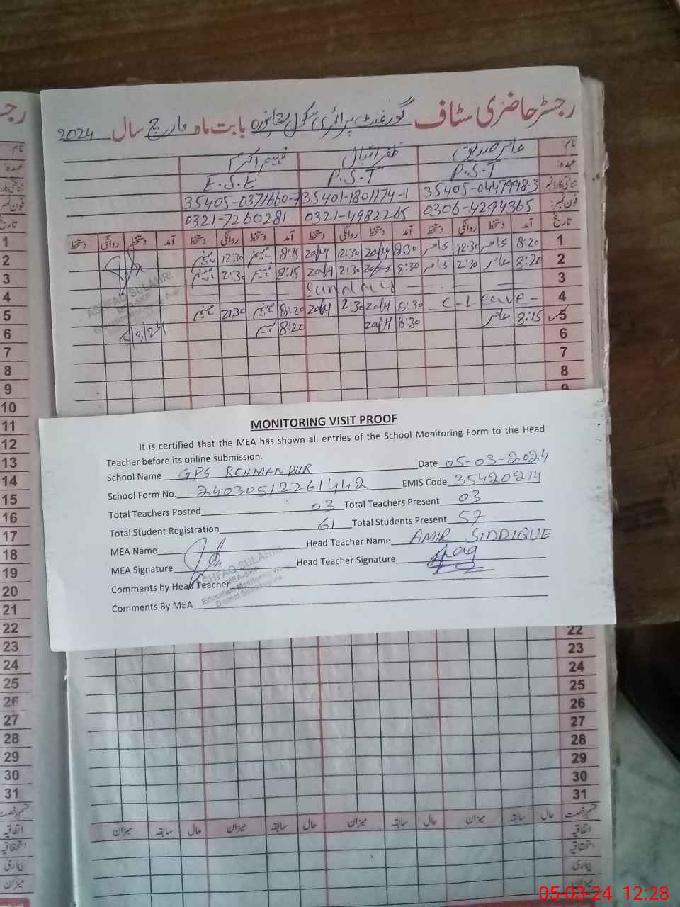 | Attendance Register | Head Teacher | MEA with School | Visit Proof |